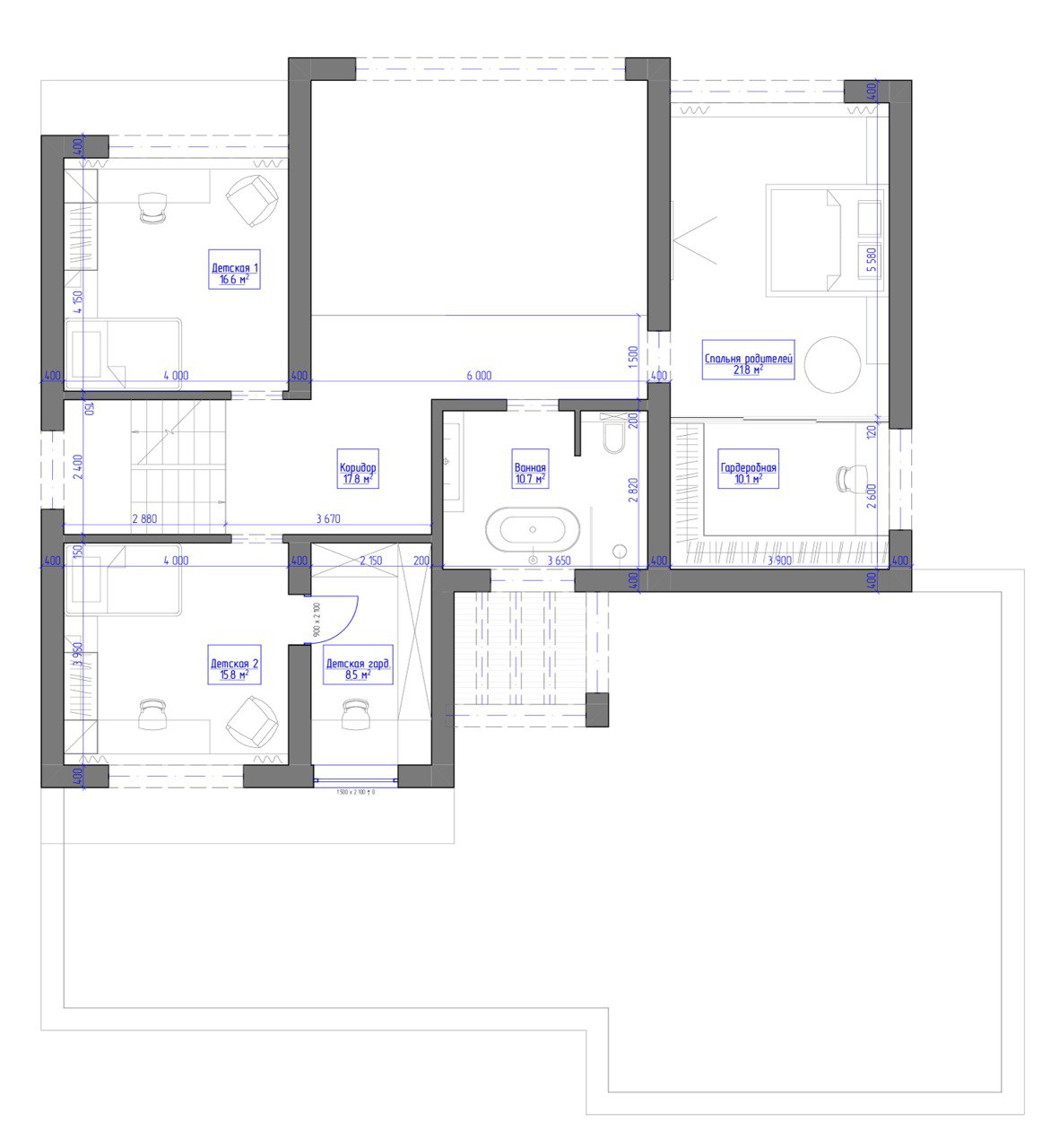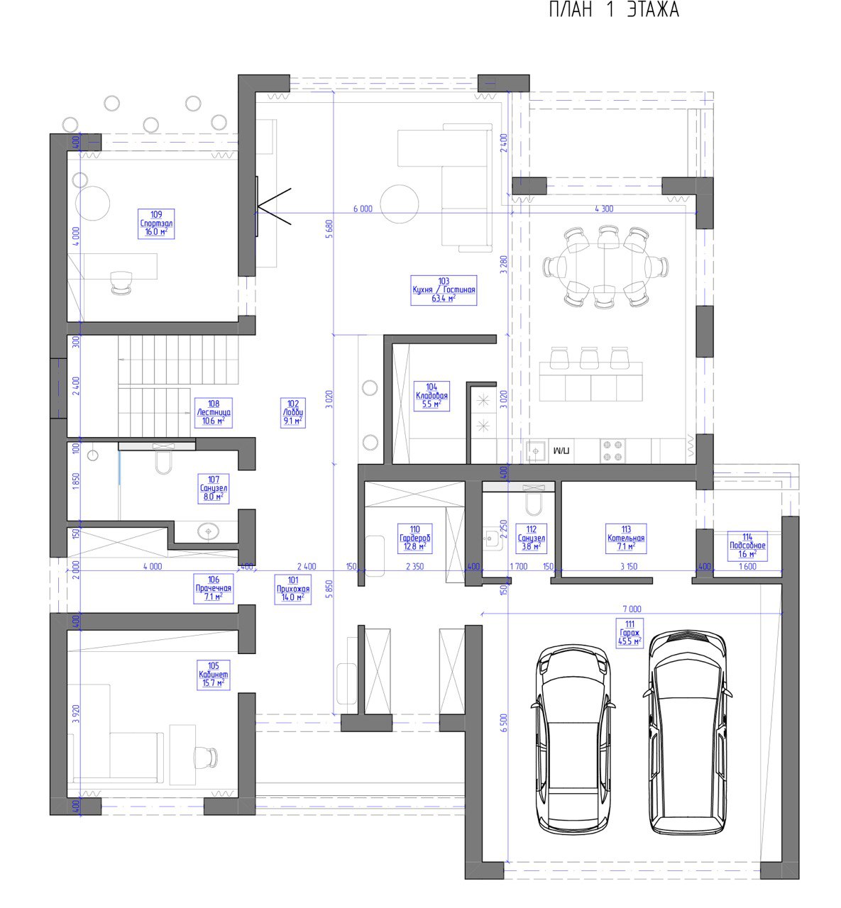 В этом проекте мы запланировали 2 парковочных места в теплом гараже, одно подсобное помещение, большую (однако уютную) кухню-гостиную, кабинет, спортзал, прачечную, 2 детских комнаты, 1 спальня родителей, просторный коридор и 3 санузла.
