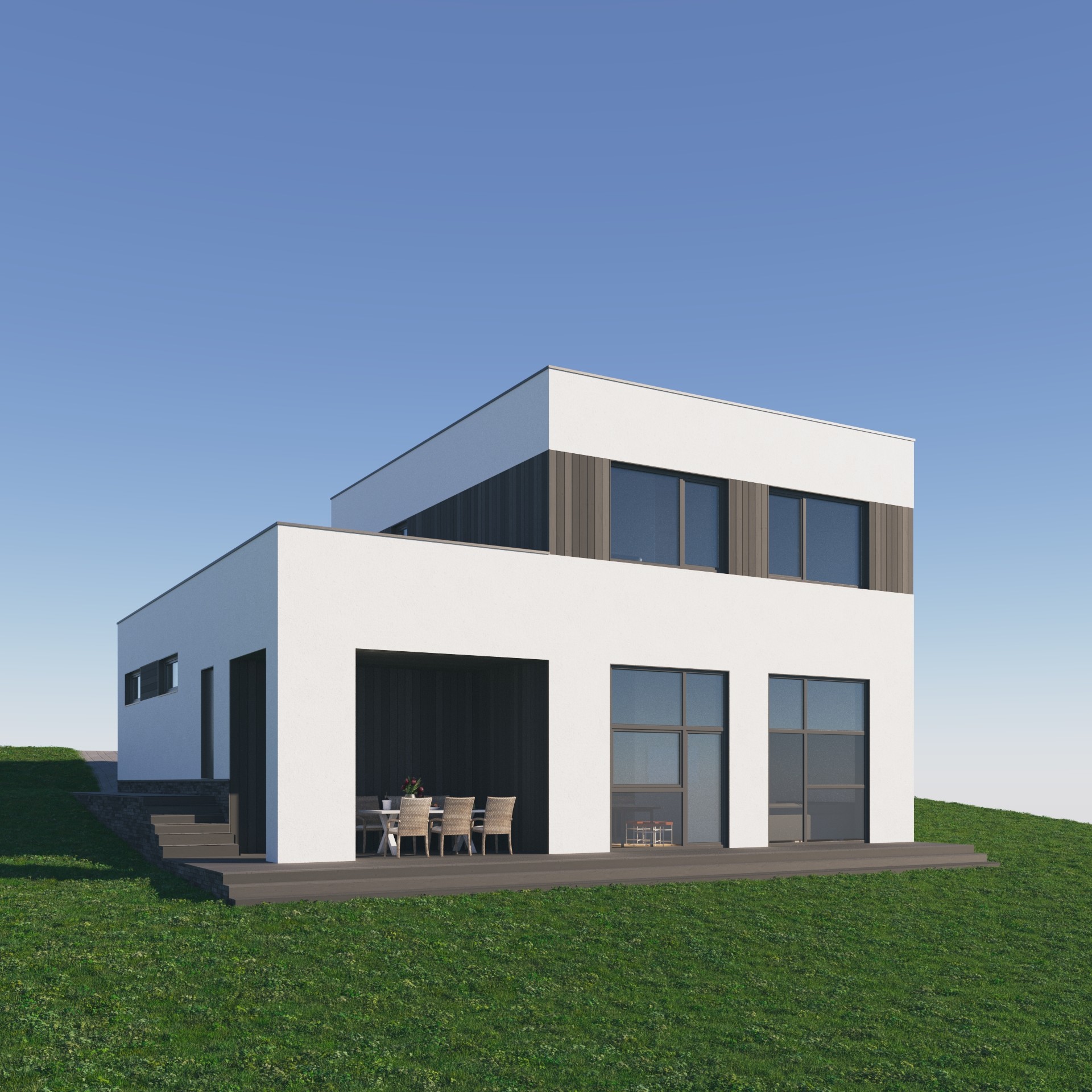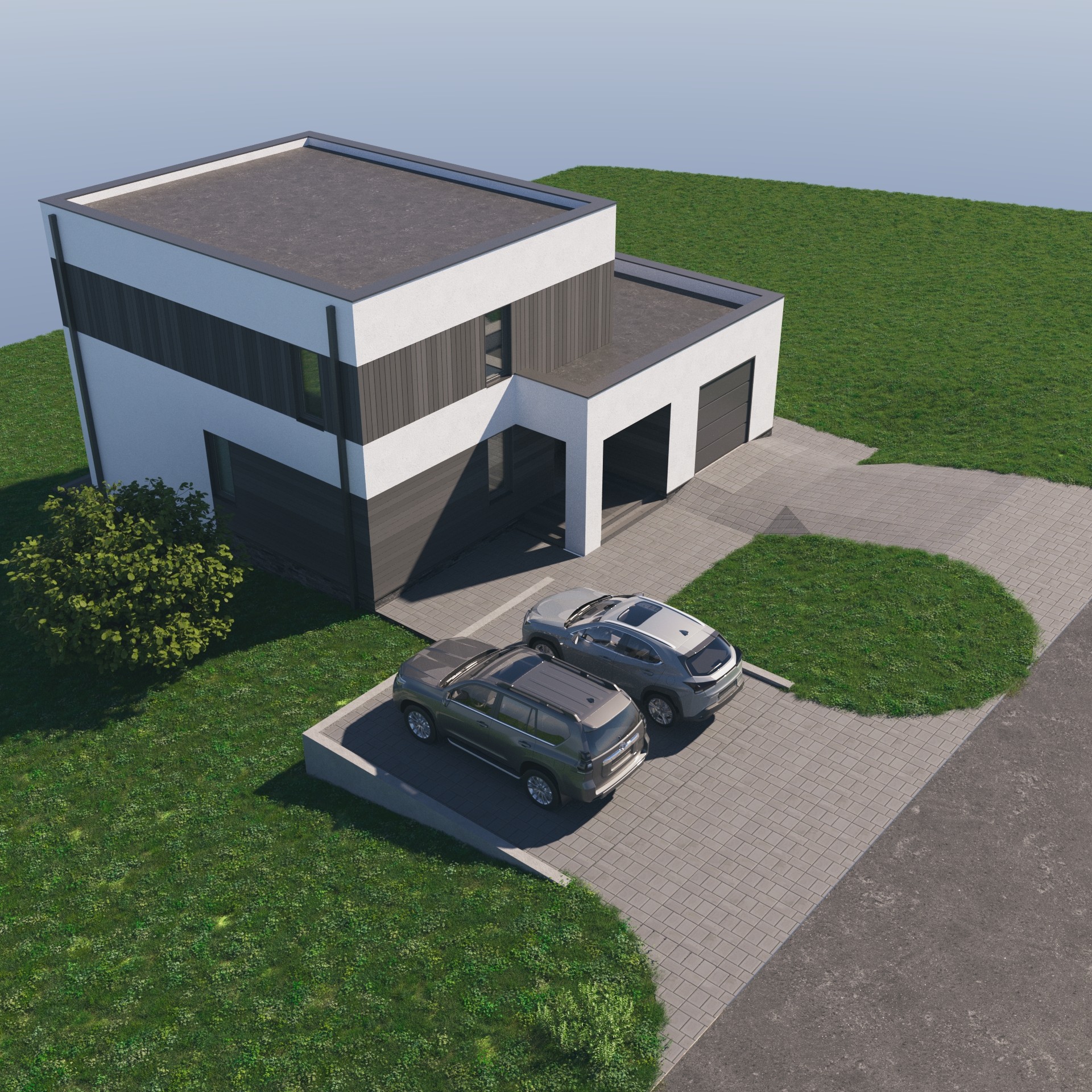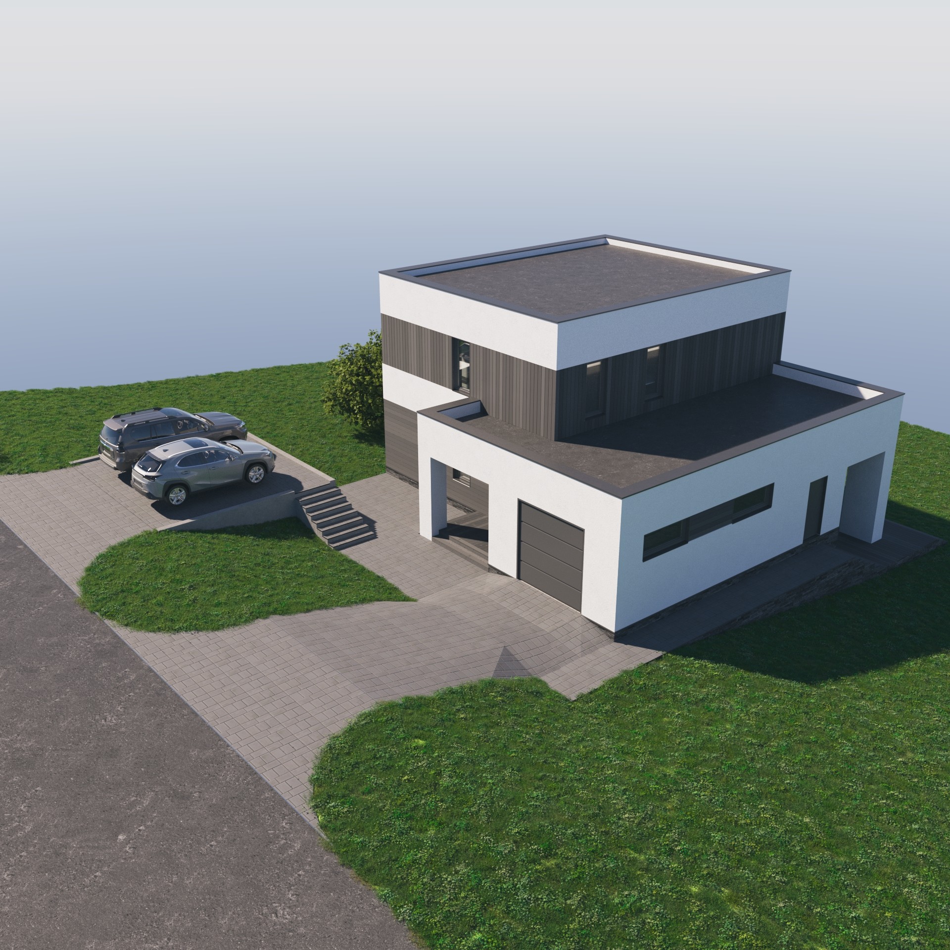 Мы также расположили на рендерах возможное расположение дорожек, которые ведут к дому с дороги. С учетом большого перепада сделать это максимально красиво было не просто. Однако и такая задача оказалась нам по плечу. На крыше первого этажа можно располагаться летом. С нее открывается шикарный вид на близлежащие окрестности города. С учетом, если ваш участок располагается рядом с лесом или озером, так вообще сказка.