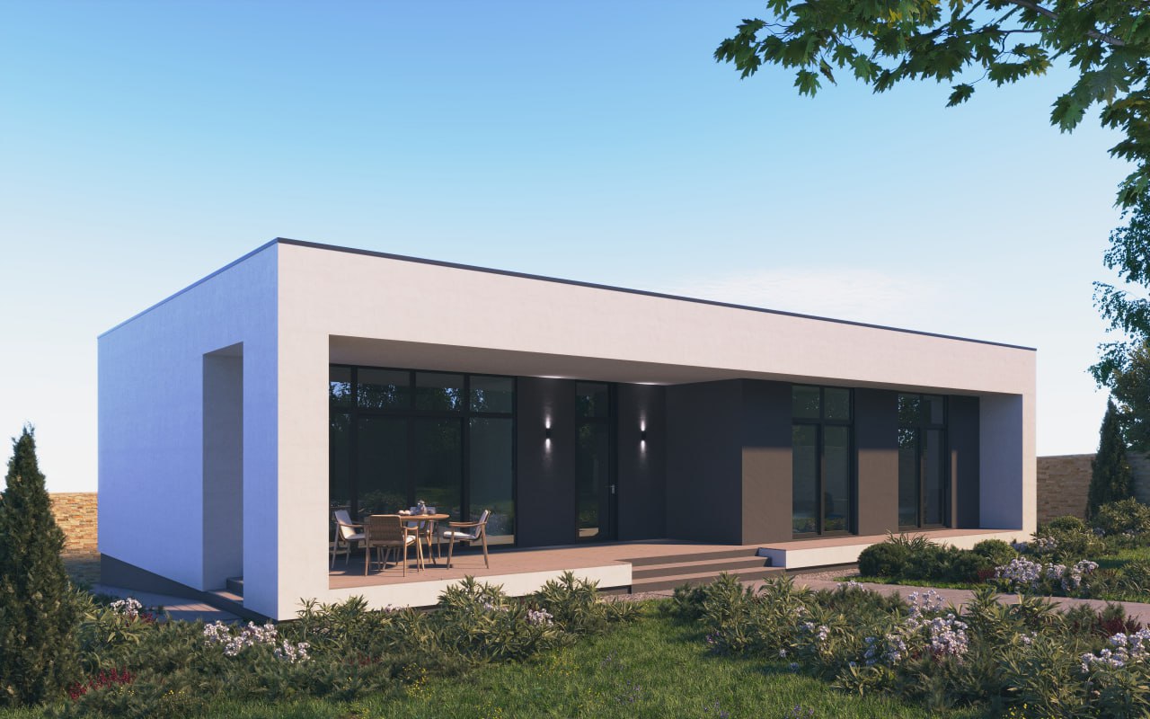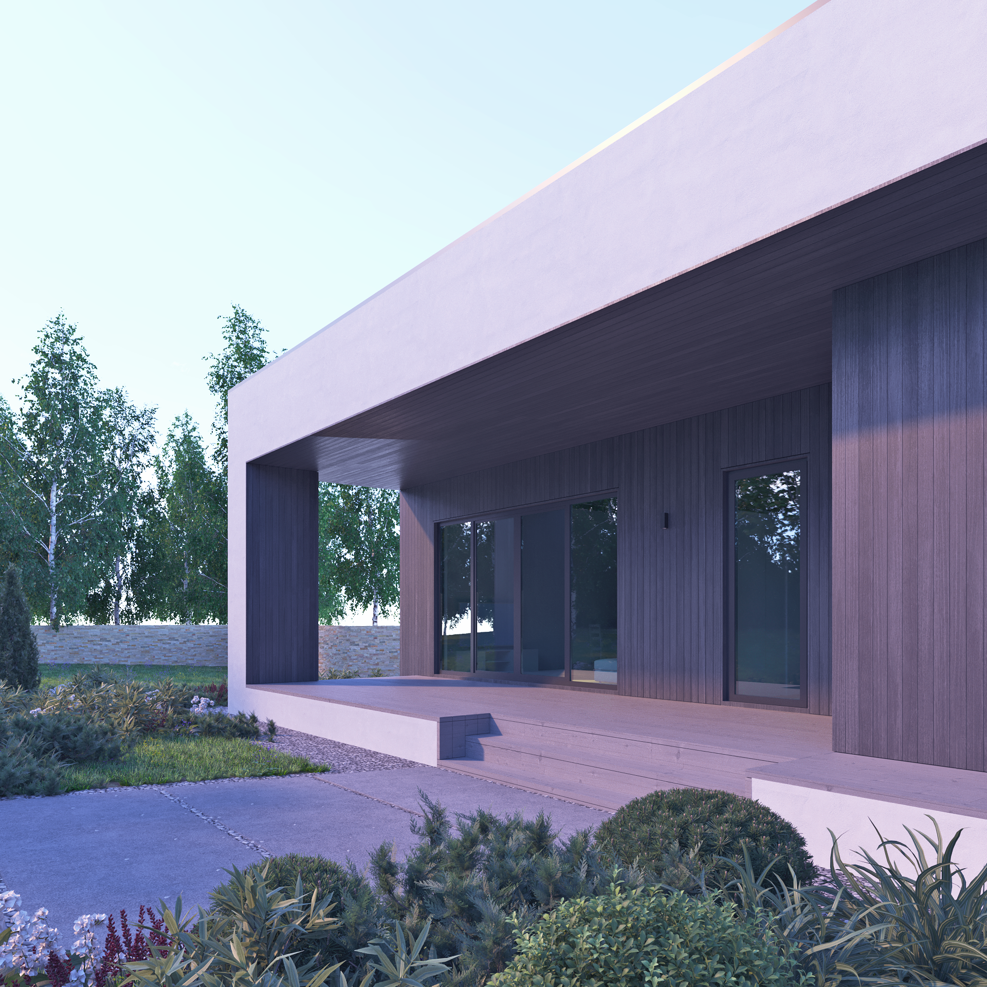 Отделка фасадов и террасы комбинированная – штукатурка, окрашенный сосновый планкен.