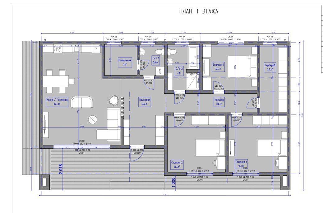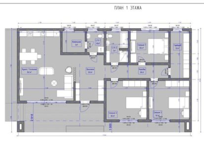 Большая и светлая кухня-гостиная с выходом на террасу. Приватная зона в виде трех спальных комнат, гардеробной. Два санузла (один для гостей дома, второй для хозяев).