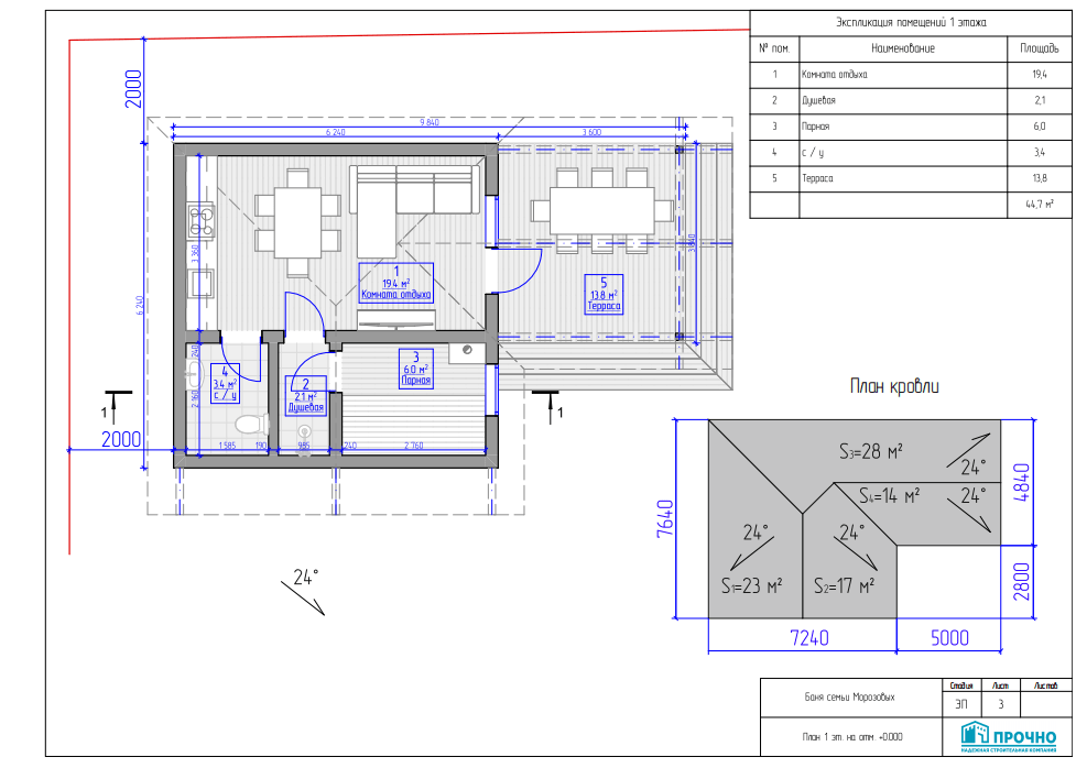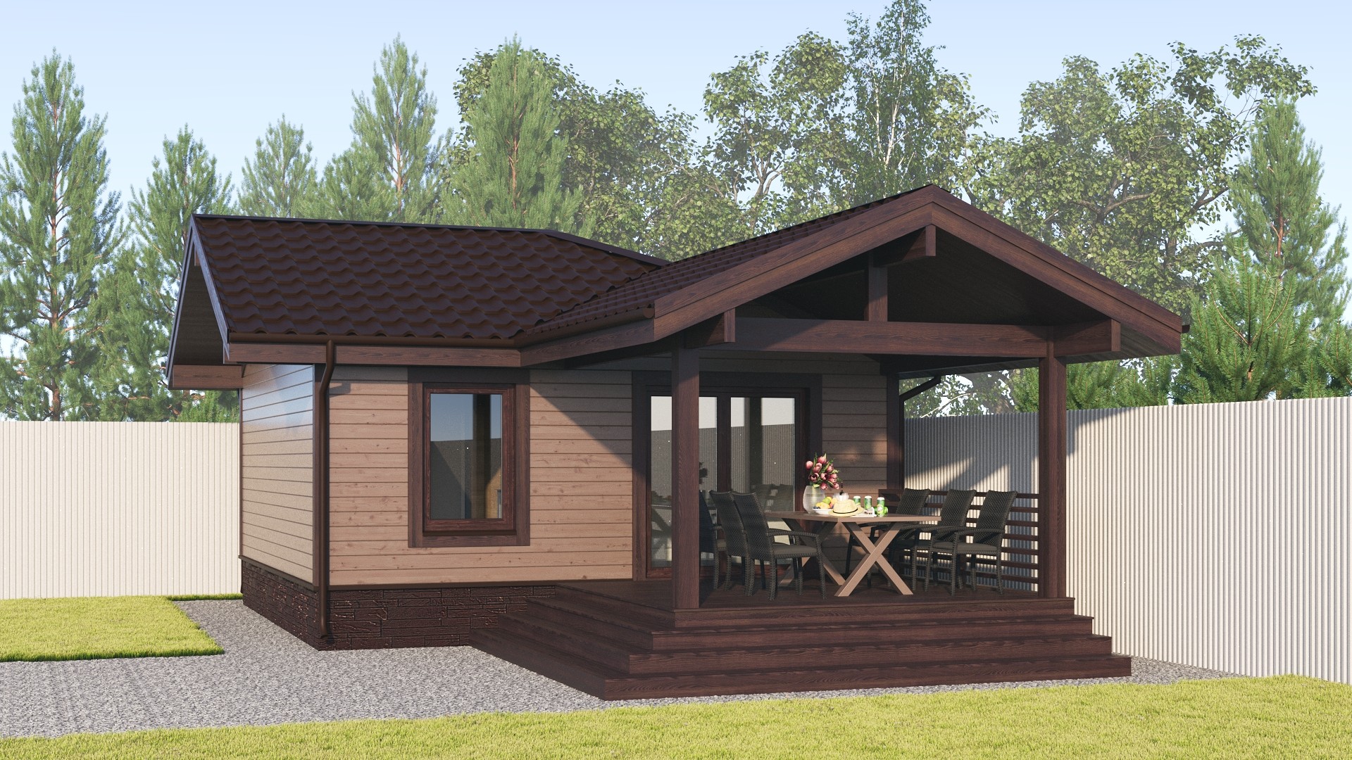 Объект Баня 45 спроектирован в одном уровне – комната отдыха с выходом на террасу, санузел, проходная душевая и сауна.