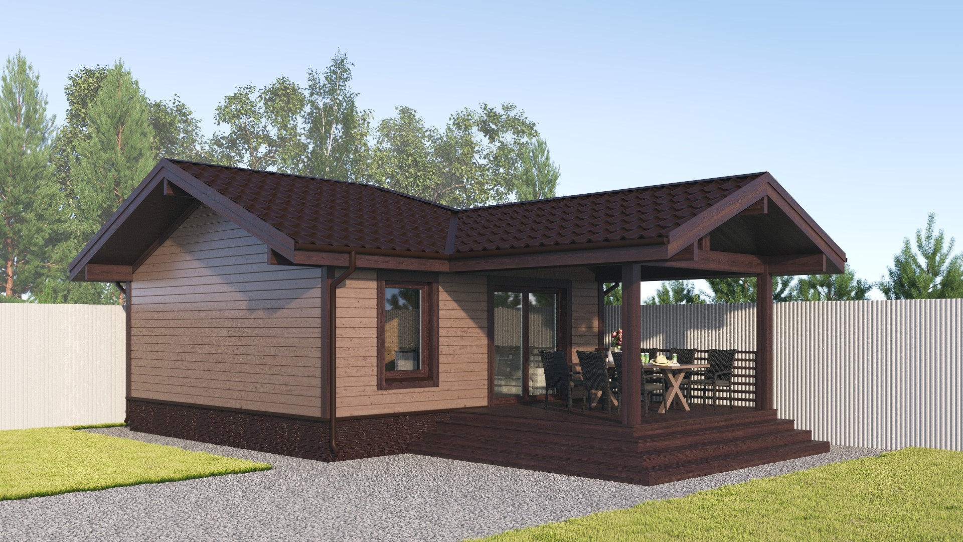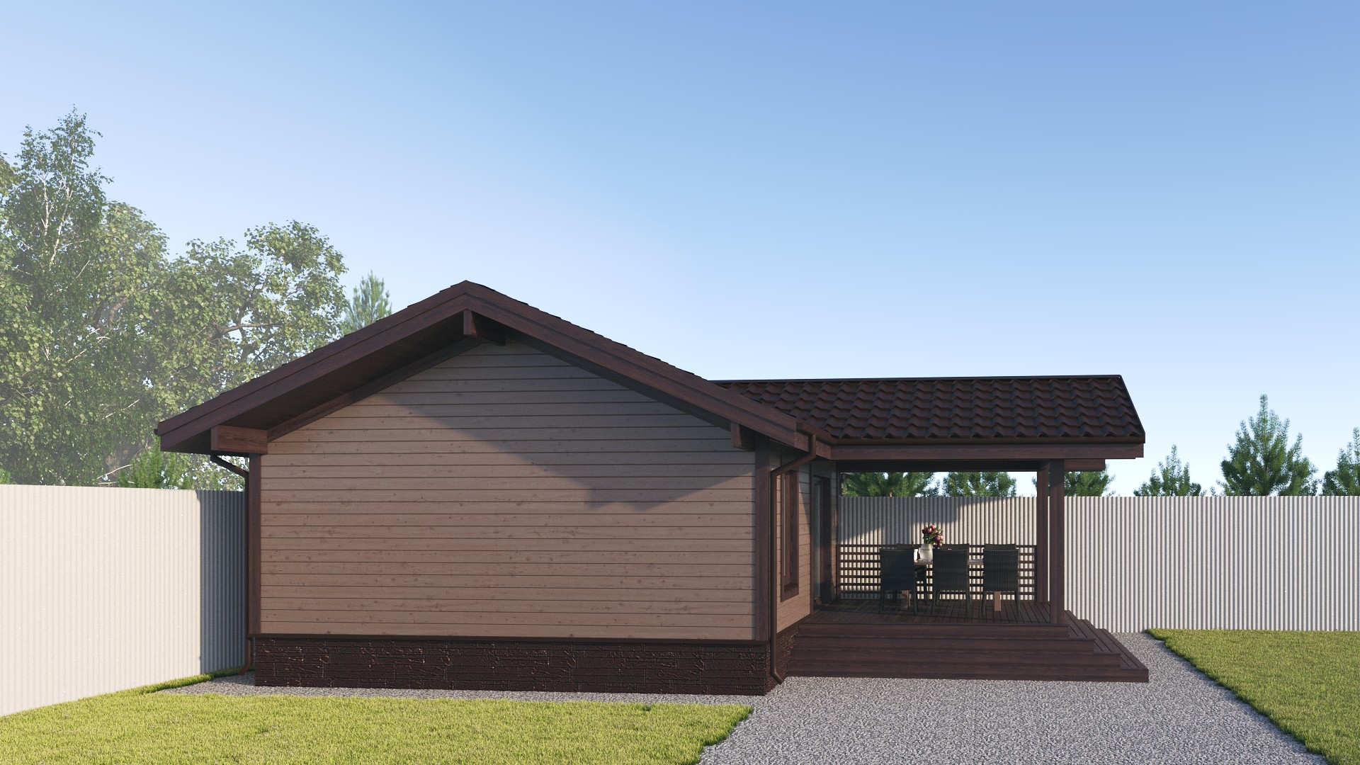 Основные цвета отделки фасадов – комбинация натурального цвета дерева в отделке фасада с Ral 8017 в отделке наличников, углов, стоек террасы, подшивки свесов кровли, подшивка скатов террасы и ее ограждений.