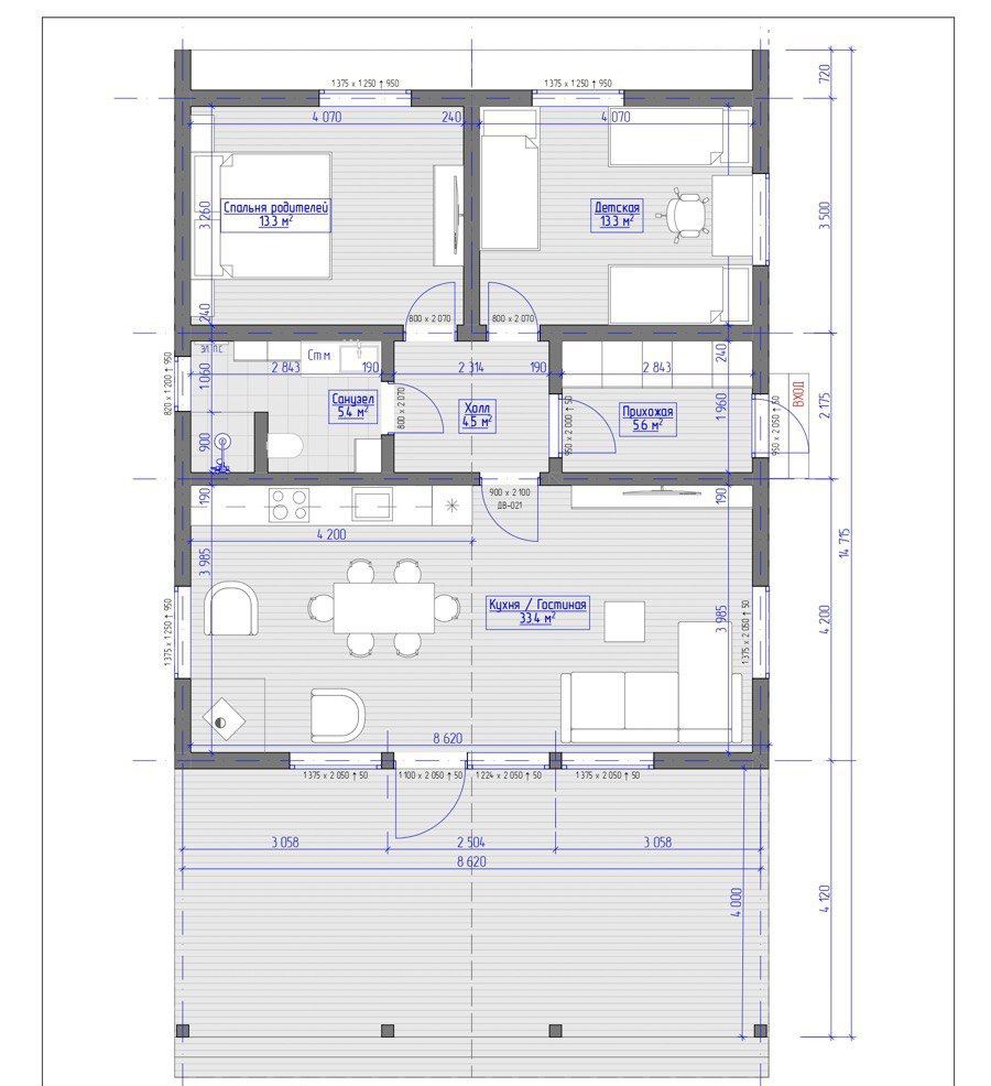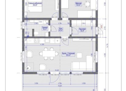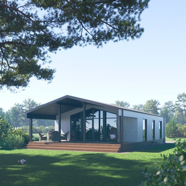 Очень уютная планировка. Просторная и светлая кухня гостиная, где можно разместить всех гостей. Спальня родителей, детская, совмещенный санузел. Комбинированная отделка фасада, где чередуется использование планкена и декоративной штукатурки. Материал кровли – гибкая черепица. Так же в этом проекте большая терраса для посиделок наедине с природой. Чтобы слушать пение птиц, встречать рассветы и провожать закаты.