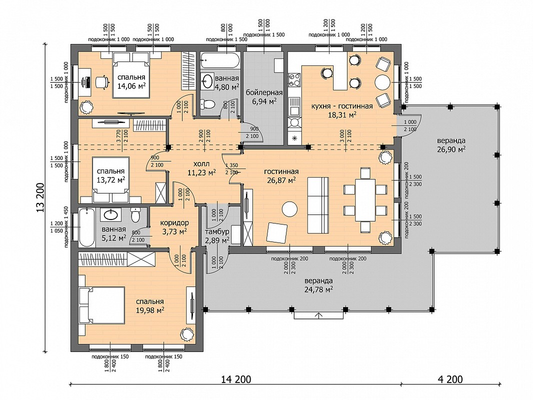 Отдельная прелесть заключается в двух совмещенных верандах. В теплые дни вы можете проводить время на свежем воздухе. Эти веранды созданы, чтобы вы сидели теплой компанией, смотрели кино, читали или вели душевные беседы, вглядываясь в звезды и кутаясь в пледы.