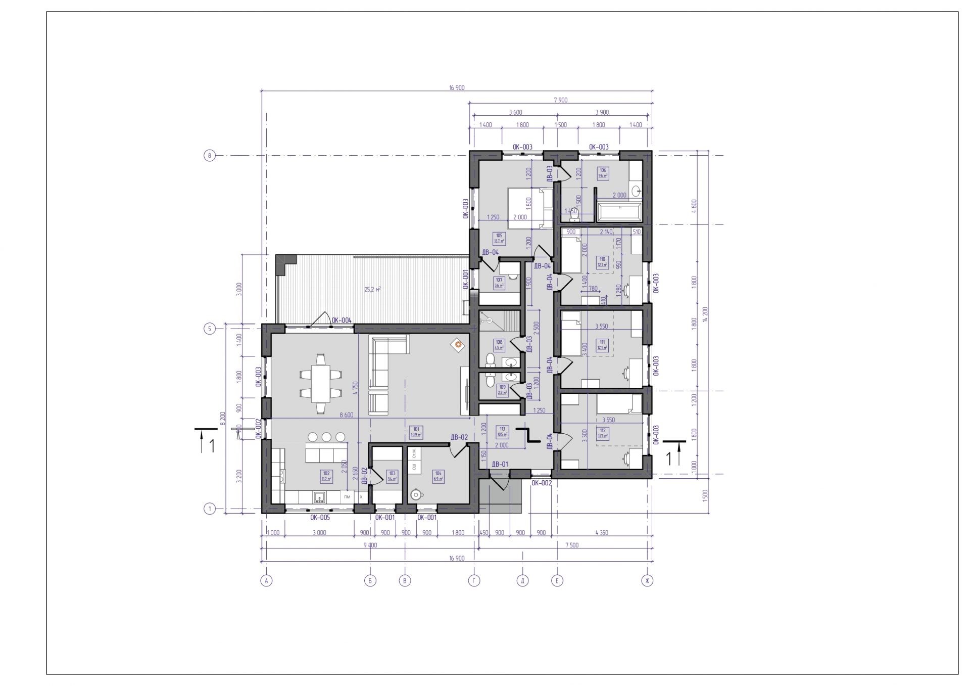 - Фасады с указанием материалов