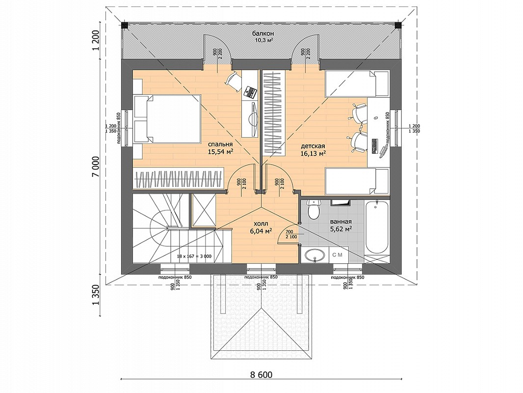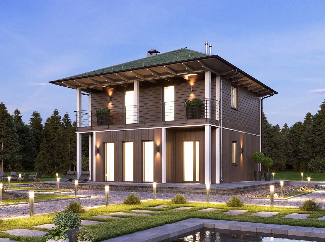 В двухэтажном доме есть большая гостиная с верандой, совмещенная с кухней, и две просторные жилые комнаты на втором этаже с видовой террасой. Три отдельные комнаты, большая ванная, санузел и три крыльца для удобства — это ли не счастье? Выбирайте дом CONSTANT 90-3, здесь вы будете засиживаться до утра за разговорами на балконе, сможете собираться со всеми друзьями по поводу и без и наконец-то подвесите гамак, о котором мечтали в городской квартире.